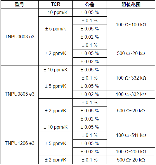 TNPU e3系列器件TCR低至 2 ppm/K,外形尺寸分别为0603、0805和1206,阻值从500 W到20 kW。新款电阻具有出色的抗高温高湿性能(85 °C;85 % RH),耐硫性符合ASTM B 809标准,工作温度-55 °C至+125 °C,即使在恶劣环境下,也可以保证极为稳定的性能。